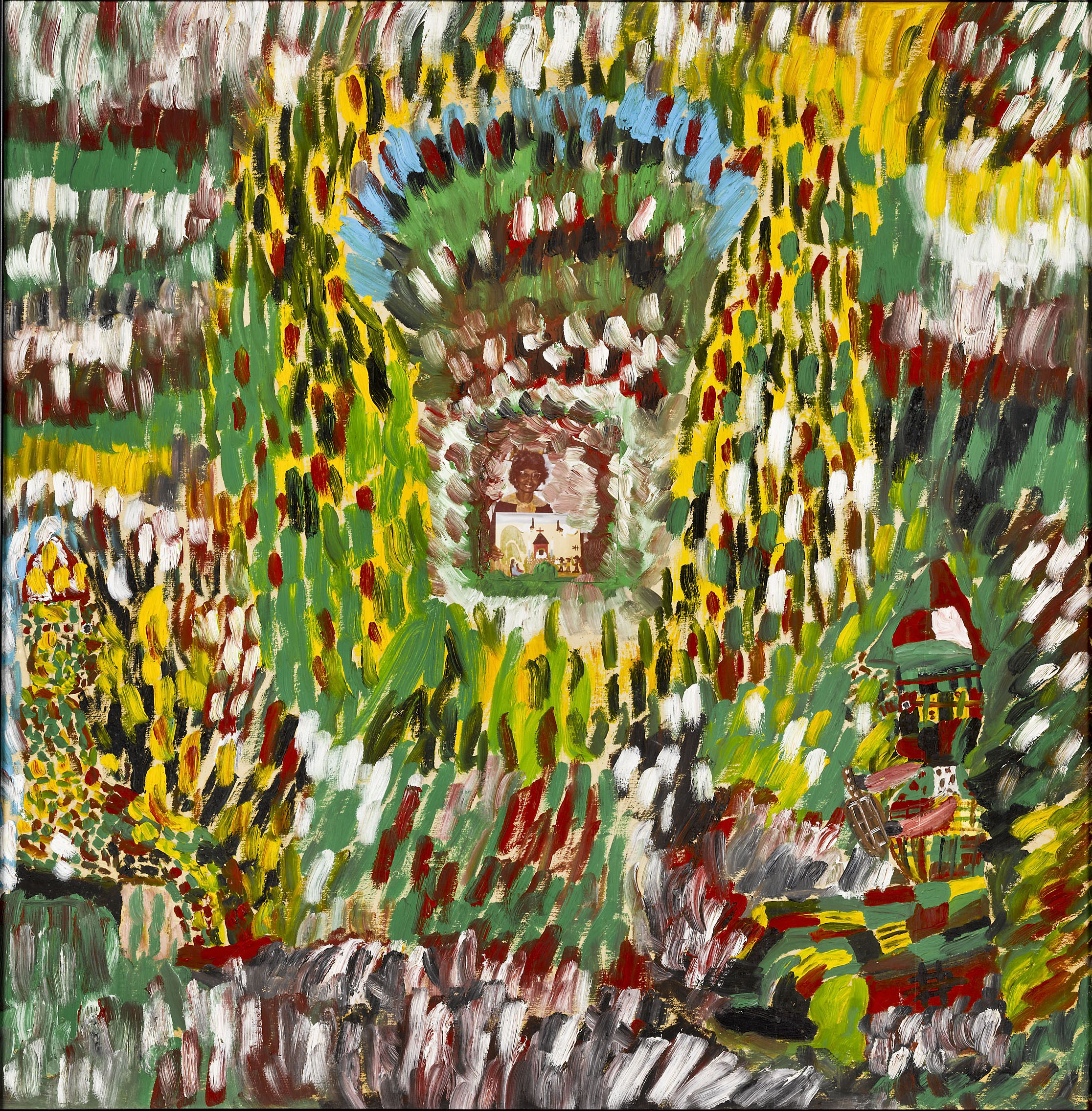 Clementine Hunter (1887–1988, Natchitoches Parish, Louisiana), Untitled, Melrose, Natchitoches Parish, Louisiana, 1975, Oil on board with photograph, 23 1/2 x 24 in., American Folk Art Museum, New York, Gift of Thomas Whitehead in memory of Ora, Garland Williams, 2005.16.1