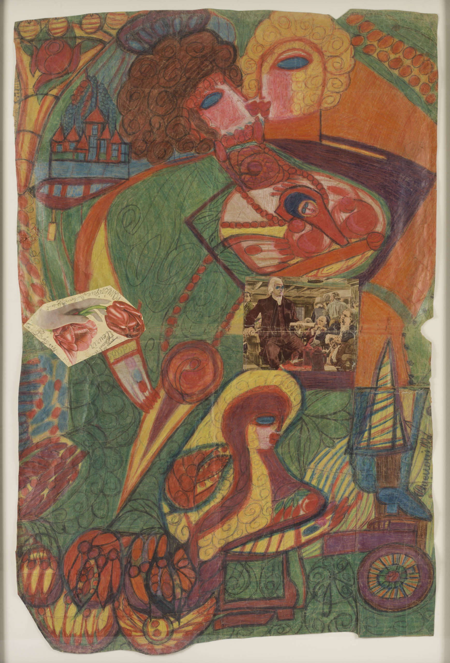 Aloïse Corbaz (1886–1964, Switzerland), Untitled (‘Fleurir [Bloom] / l’Amérique Stubborn Président [the Stubborn, American President] / Prégny / Quenouille [Bulrush]’), La Rosière Psychiatric Hospital, Gimel-sur-Morges, Switzerland, c. 1956, Colored pencil, graphite, sewn paper cutouts on wrapping paper, 47 5/8 x 30 1/2 in., American Folk Art Museum, New York, Gift of Audrey B. Heckler, 2025.14.2